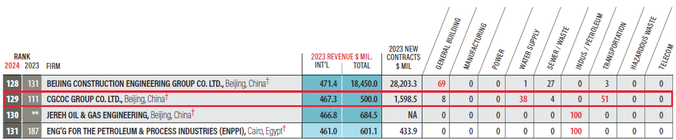 2024年度《美國工程新聞紀(jì)錄(ENR)》全球最大250家國際承包商榜單節(jié)選